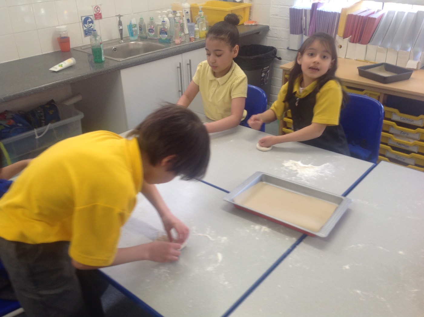 For our RE lesson, we got to make bread! We learned about bread and wine as symbols relating to Easter, which are used by people all over the world to celebrate Holy Communion. The children got to make bread and talk about how Christians still share bread and wine today to remember Jesus’ death, in order that humans could be saved and have a relationship with God once again. Whilst kneading the bread, some of the children got very messy!