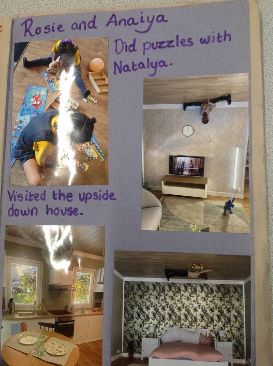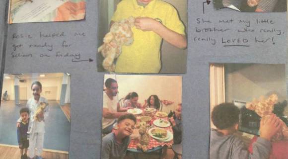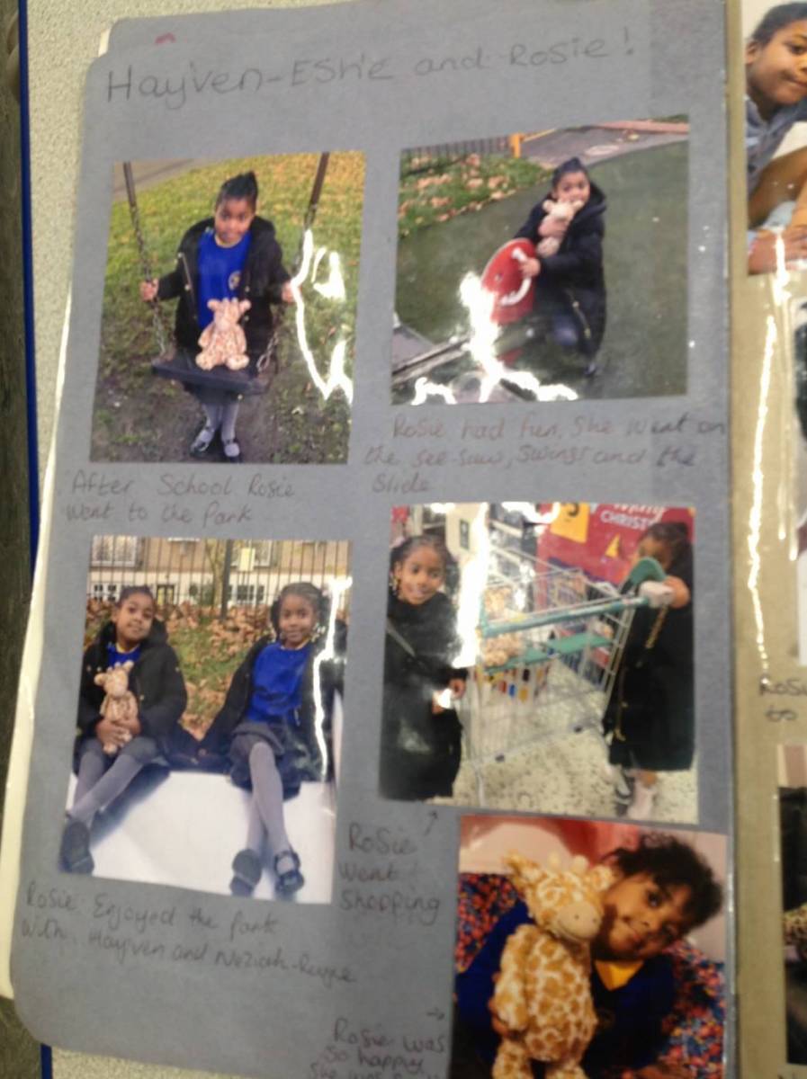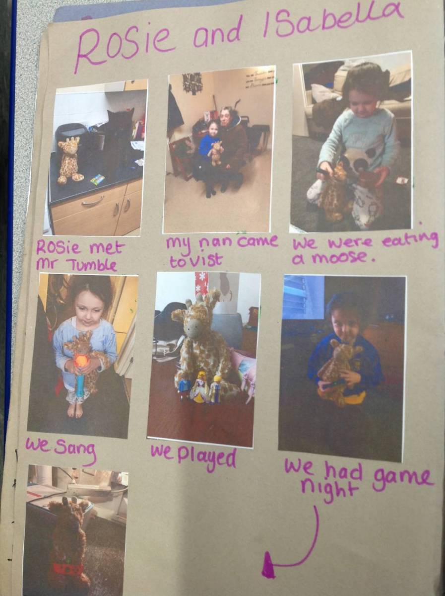 Every week somebody is chosen to take Rosie (our pet giraffe) home with them. We then put photos into her book and write about the adventures that she had had with us.