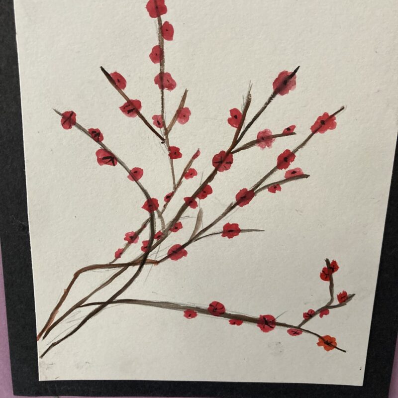 To recreate his work, we sketched an outline of a tree, with blossom, in pencil then used a very fine watercolour paintbrush to add detail to our tree and blossom.