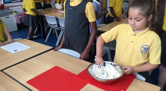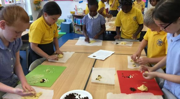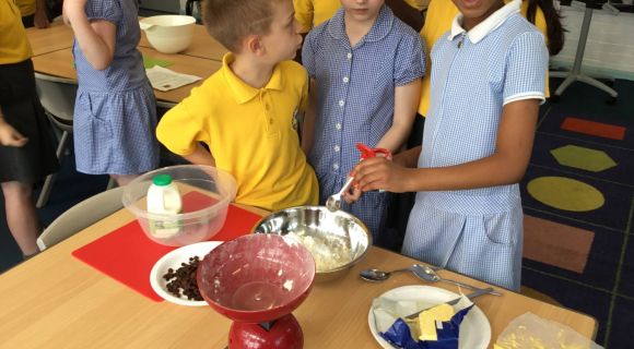 We also used our knowledge and learning from maths and measuring the weight of the ingredients in grams using scales. We were able to follow written step by step instructions to make our cookies.