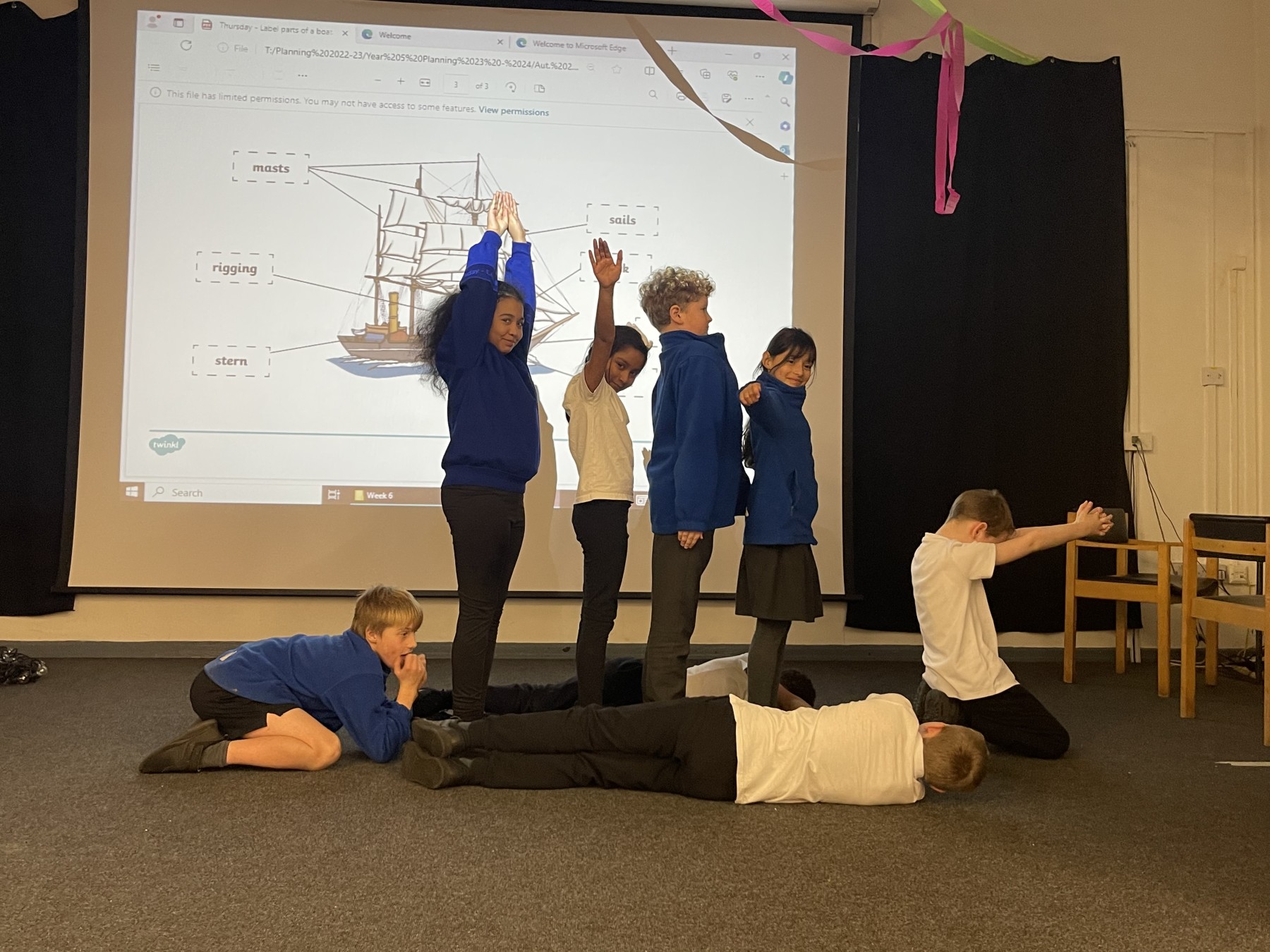 We learned about the different parts of a ship and what their purpose was and worked in groups to create our very own exploration ships using our bodies.
